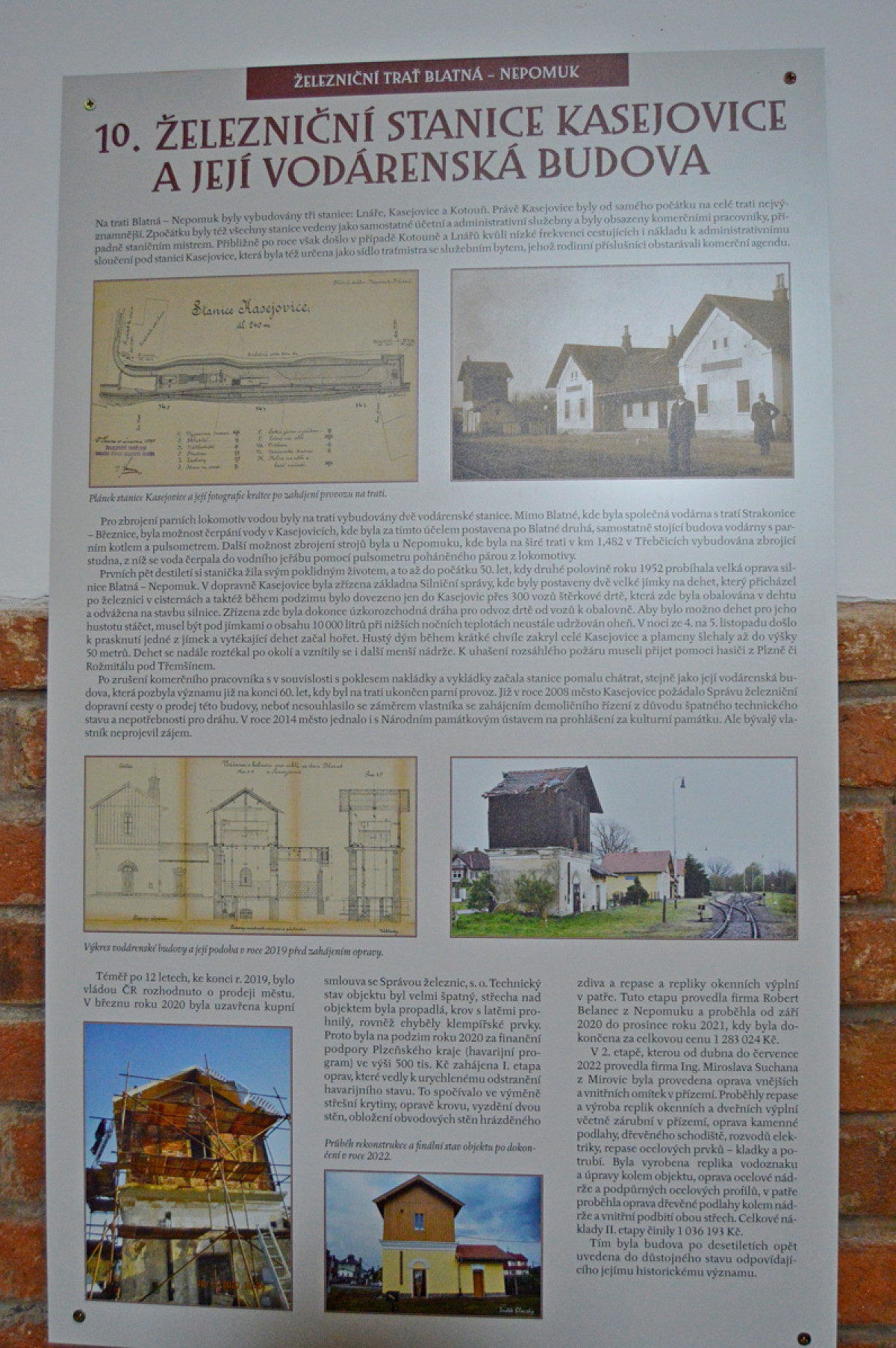 Vodárnu Město Kasejovice po dlouhých letech jednání získalo do majetku a v roce 2022 byla opravena do bývalé podoby. Ministerstvo kultury ČR ocenilo jedinečnost této stavby, když ji v roce 2020 prohlásilo za technickou památku. V roce 2023 byla ve vodárně umístěna stálá expozice p. Martina Žabky, která nás na deseti panelech provede historií železniční trati Nepomuk - Blatná.