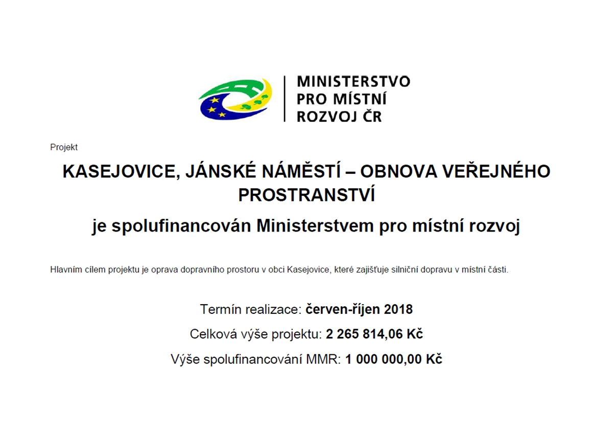 Koncem července byla zahájena rekonstrukce Jánského náměstí v Kasejovicích a to spodní části náměstí. Bylo provedeno položení asfaltového betonu na obslužnou místní komunikaci a pokládka kamenných kostek na parkovací místa u domů. Úprava této části náměstí byla dokončena počátkem října a vyžádala si finanční prostředky ve výši 2 265 814,06 Kč.