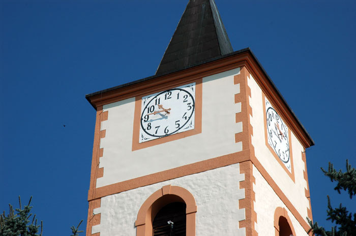 Kostelní věž byla vetknuta do hmoty lodi v jejím jihozápadním nároží a chodilo se do ní přímo z kostela po dřevěném schodišti. Možná se zde nacházel i depozitář, v němž byly v případě nebezpečí uschovávány cennosti jako liturgické oděvy, náčiní, knihy apod. Poslední poschodí bylo vyhrazeno obranným účelům. Zde je též nutno podotknouti, že věž je dnes vyšší o jedno patro, které bylo přistavěno až r. 1892 v souvislosti s instalací hodinových ciferníků.