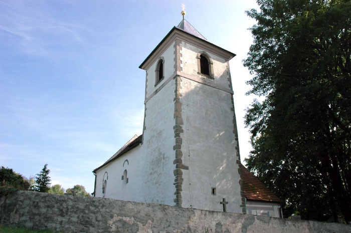 Kostel je jednolodní stavba s čtvercovým kněžištěm a hranolovou, 21,6 m vysokou věží přistavěnou k severozápadnímu koutu lodi. Na její jižní a západní straně se dochovala původní štěrbinová okénka, v posledním patře jsou čtyři půlkruhově zaklenutá okna. Stejný počet podobně řešených oken osvětluje loď kostela, při čemž na jižní straně jsou zdůrazněny vrcholně gotické tvary včetně pozůstatků kružby a na straně severní kamenné ostění románského charakteru. Na západní straně lodi se dochovalo okénko ve tvaru rozety, dnes však zakryté pultovou střechou předsíně.