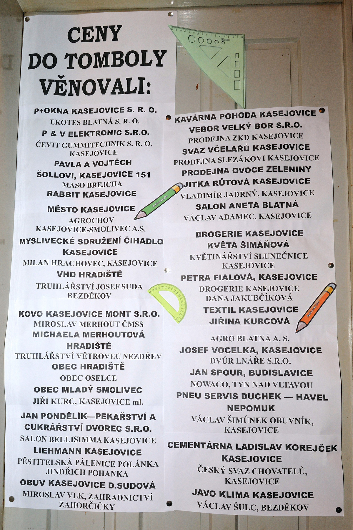 P+OKNA KASEJOVICE S. R. O.; EKOTES BLATNÁ S. R. O.; P & V ELEKTRONIC S.R.O.; ČEVIT GUMMITECHNIK S. R. O. KASEJOVICE; PAVLA A VOJTĚCH ŠOLLOVI, KASEJOVICE 151; MASO BREJCHA; RABBIT KASEJOVICE; MĚSTO KASEJOVICE; AGROCHOV KASEJOVICE-SMOLIVEC A.S.; MYSLIVECKÉ SDRUŽENÍ ČIHADLO KASEJOVICE; MILAN HRACHOVEC, KASEJOVICE; VHD HRADIŠTĚ; TRUHLÁŘSTVÍ JOSEF SUDA BEZDĚKOV; KOVO KASEJOVICE MONT S.R.O.; MIROSLAV MERHOUT ČMSS; MICHAELA MERHOUTOVÁ, HRADIŠTĚ; TRUHLÁŘSTVÍ VĚTROVEC NEZDŘEV; OBEC HRADIŠTĚ; OBEC OSELCE; OBEC MLADÝ SMOLIVEC; JIŘÍ KURC, KASEJOVICE ml.; JAN PONDĚLÍK—PEKAŘSTVÍ A CUKRÁŘSTVÍ DVOREC S.R.O.; SALON BELLISIMMA KASEJOVICE ; LIEHMANN KASEJOVICE; PĚSTITELSKÁ PÁLENICE POLÁNKA JINDŘICH POHANKA; OBUV KASEJOVICE D.SUDOVÁ; MIROSLAV VLK, ZAHRADNICTVÍ ZAHORČIČKY; KAVÁRNA POHODA KASEJOVICE; VEBOR VELKÝ BOR S.R.O.; PRODEJNA ZKD KASEJOVICE; SVAZ VČELAŘŮ KASEJOVICE ; PRODEJNA SLEZÁKOVI KASEJOVICE; OVOCE ZELENINA JITKA RŮTOVÁ KASEJOVICE; VLADIMÍR JADRNÝ, KASEJOVICE; SALON ANETA BLATNÁ VÁCLAV ADAMEC, KASEJOVICE; DROGERIE KASEJOVICE KVĚTA ŠIMÁŇOVÁ; KVĚTINÁŘSTVÍ SLUNEČNICE KASEJOVICE; PETRA FIALOVÁ, KASEJOVICE; DROGERIE KASEJOVICE DANA JAKUBČÍKOVÁ; TEXTIL KASEJOVICE JIŘINA KURCOVÁ ; AGRO BLATNÁ A. S.; JOSEF VOCELKA, KASEJOVICE ; DVŮR LNÁŘE S.R.O.; JAN SPOUR, BUDISLAVICE; NOWACO, TÝN NAD VLTAVOU; PNEU SERVIS DUCHEK — HAVEL NEPOMUK; VÁCLAV ŠIMŮNEK OBUVNÍK, KASEJOVICE; CEMENTÁRNA LADISLAV KOREJČEK KASEJOVICE; ČESKÝ SVAZ CHOVATELŮ, KASEJOVICE; JAVO KLIMA KASEJOVICE; VÁCLAV ŠULC, BEZDĚKOV