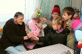 Seniory před Velikonocemi, 3. a 4.4.2012, navštívily děti s učitelkami a členky Červeného kříže